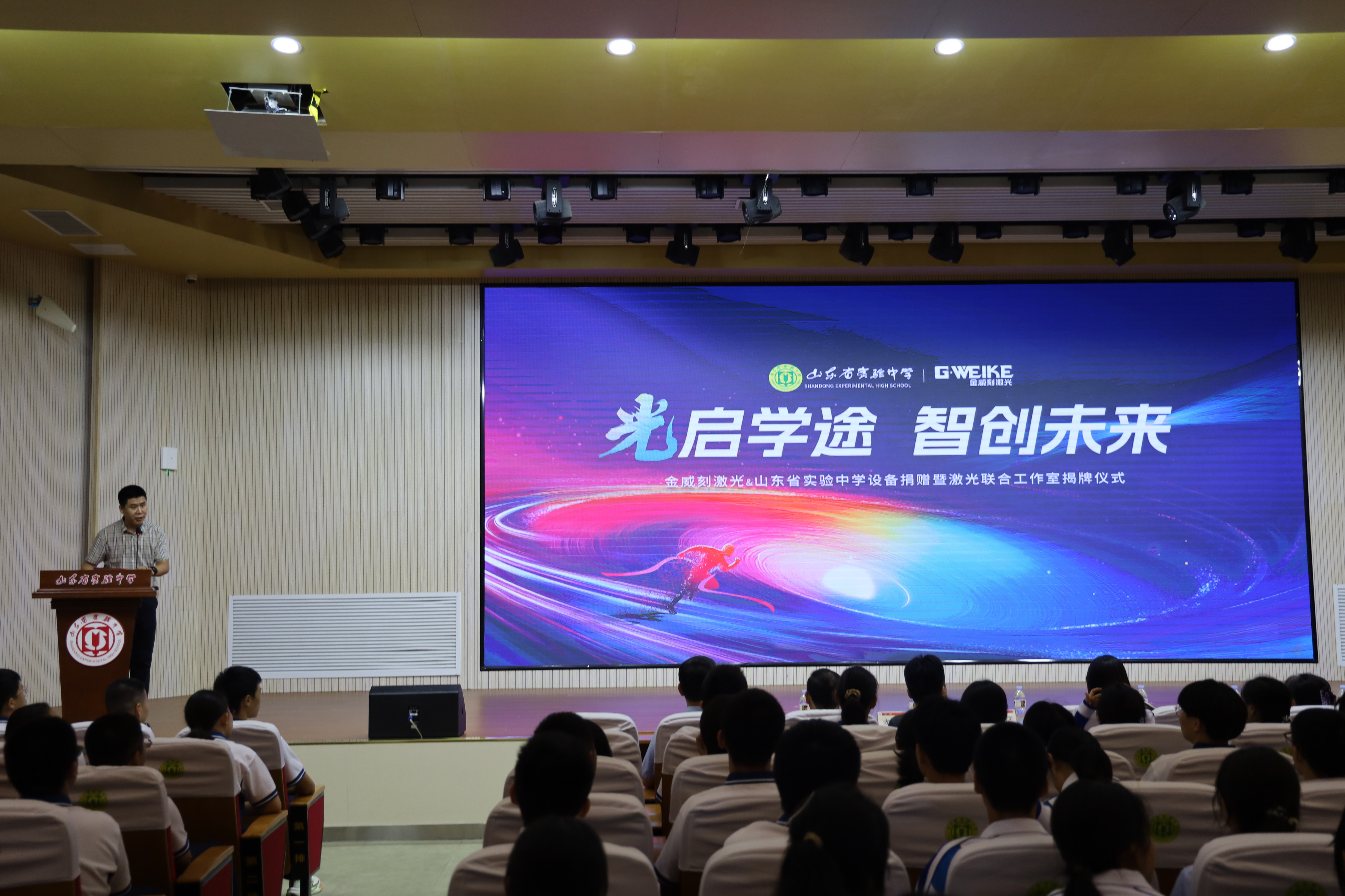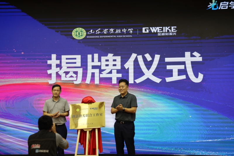为推动学校科学教育从理论走向实践、探索中学产教融合新模式,9月16日下午,山东省实验中学与金威刻激光设备捐赠暨“创意激光联合工作室”揭牌仪式在致德报告厅举行。金威刻激光董事长兼总经理蒋习锋、副总经理崔梦晨,山东省实验中学党委书记方奎明、中心校区执行校长于永水及师生代表参与活动。教学管理部副主任兼升学指导中心副主任侯成刚主持活动。