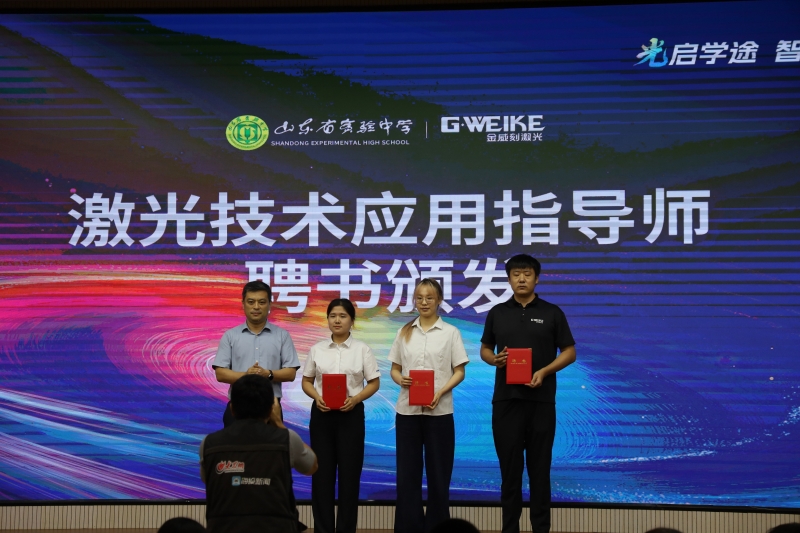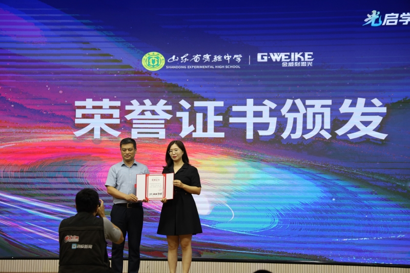于永水校长为崔梦晨副总经理颁发捐赠证书,并为金威刻3名工程师颁发“激光技术应用指导师”聘书。他们将定期为山东省实验中学同学们提供激光技术应用指导与培训,真正实现“科技走进课堂,创意照进现实”。
