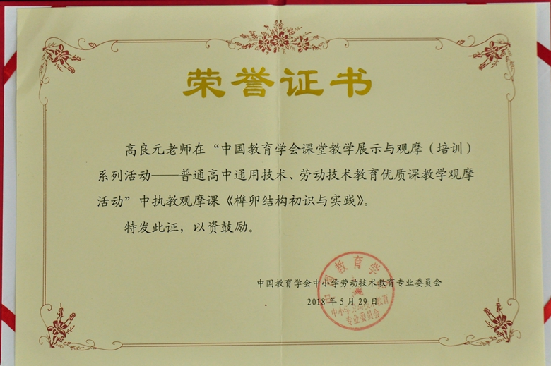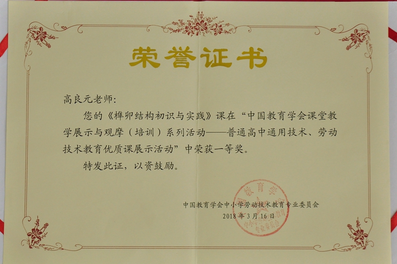 中国教育学会中小学劳动技术教育专业委员会根据中国教育学会相关要求下发推选展示通知,省(自治区、直辖市)教研室进行逐层选拔,共推荐78节优质课进行评选。组委会按照“客观、公平、公正”的原则,组织专家评委对推荐课例进行了认真评选,于2018年3月共评出一等奖26名,二等奖34名,三等奖18名,在中国教育学会进行了为期10天的公示后发布获奖公告。参评的每一节课都是各省(自治区、直辖市)经过精心打磨的优秀课例,高良元老师的《榫卯结构初识与实践》一课,通过讲解展示、技术试验、模拟演示、亲手实践等环节让学生对榫卯结构有所认识,并让学生亲手加工了榫卯结构,有效渗透了德育思想,充分贯彻了技术意识和物化能力核心素养,使中华传统文化得以宏扬,榫卯工艺得以实践,工匠精神得以渗透。