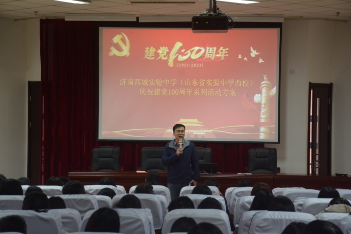 钟红军副校长解读《济南西城实验中学(山东省实验中学西校)庆祝建党100周年系列活动方案》。围绕建党100周年,学校将在全体党员和全校师生范围内,开展以“学党史、忆初心、强信念、担使命”为主题的庆祝建党100周年系列活动,通过“党的故事我来讲”、“红色歌曲我传唱”、寻访红色基地、《红色家书》咏诵、党员共读一本书等活动,让红色基因在师生传承中焕发新时代光芒。