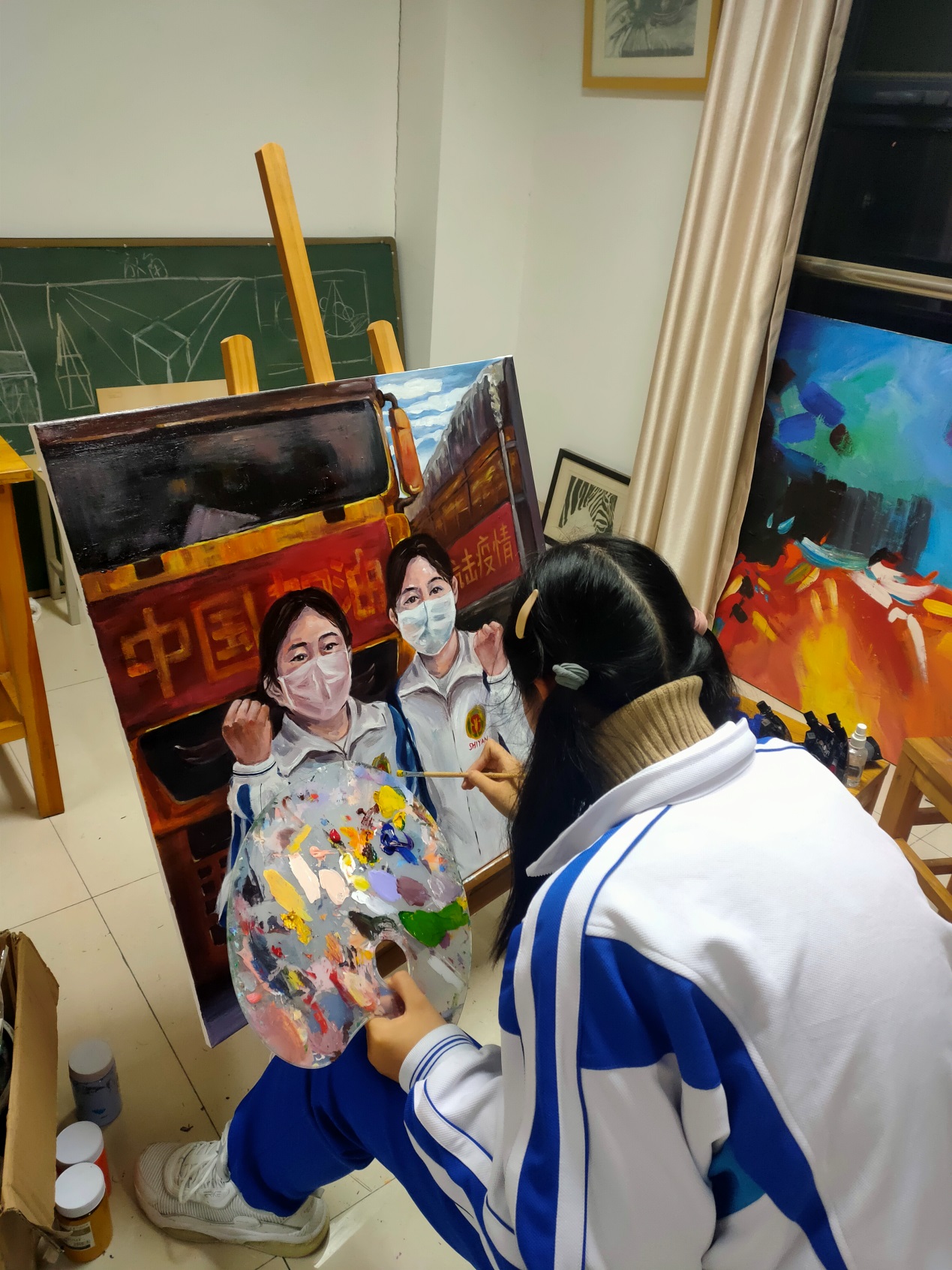 高一52班任昕睿同学的油画作品《中国加油》以身边同学为创作题材,采用油画的形式,展现了青年一代同心抗疫,中国必胜的坚定信心。