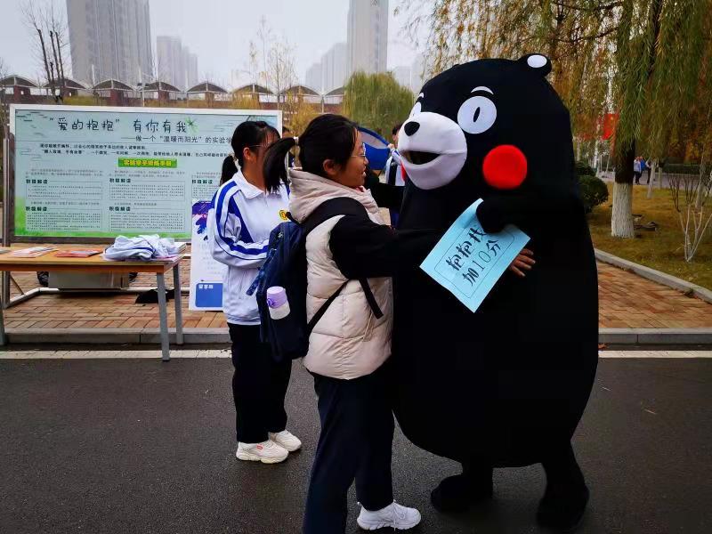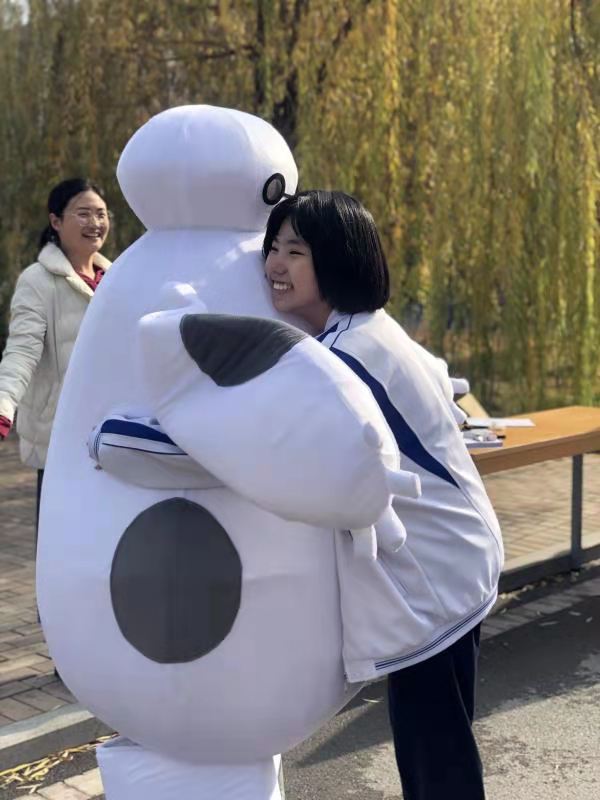 对高中生而言,紧张的学习状态、纷繁复杂的心路成长历程,尤其在考试前后等重要时间节点,容易出现消极情绪状态。在最适当的时间引导学生觉察自我心理状态,悦纳自我,培养积极的心理品质,尤为重要。基于此,我校开展了“爱的抱抱”心理健康教育活动。借由青年学生喜闻乐见的大白、小黄人、熊本等玩偶,以生活化活动形式,为同学们提供一种获取心理能量的途径,在拥抱、微笑、鼓励的热情互动中感受温暖、体味支持,不仅能促进心理减压,还可以引导同学们去感受人际互动中爱的流动,进而开放自己,悦纳别人,在彼此的关怀中感受温暖、觉察接纳、汲取力量。