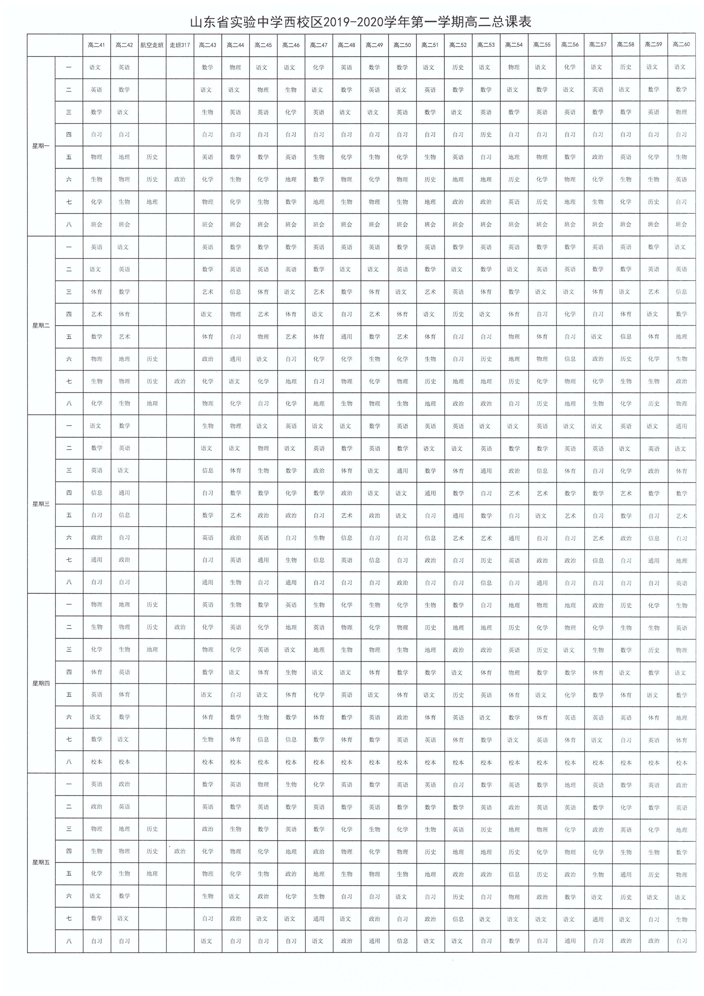 山东省实验中学西校2019-2020学年度第一学期高二年级课程安排表