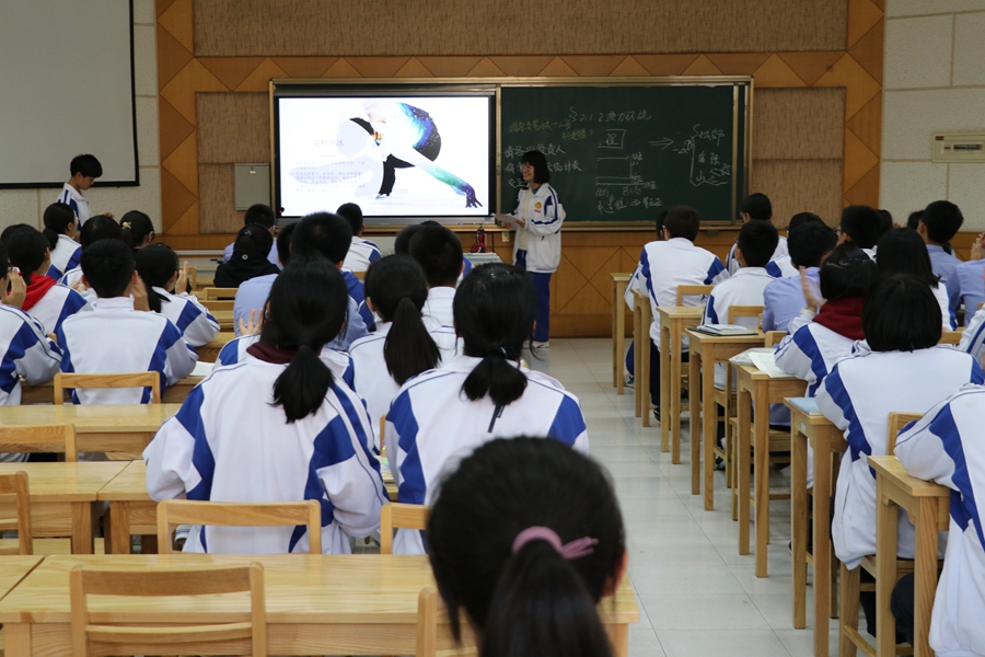 之后,她介绍了几位退役及未退役的运动员,并向同学们展示了许多花样滑冰表演的视频。在视频中,轻盈的运动员在冰场上自由地滑动,倏而优美地向上连续地跳跃,倏而快速地收紧身体旋转起来,如此富有表现力的运动也让同学们惊叹不已,叫好声起伏于运动员的每一个高难度动作之中。同学们从中真切地感受到了花样滑冰的无穷魅力。
