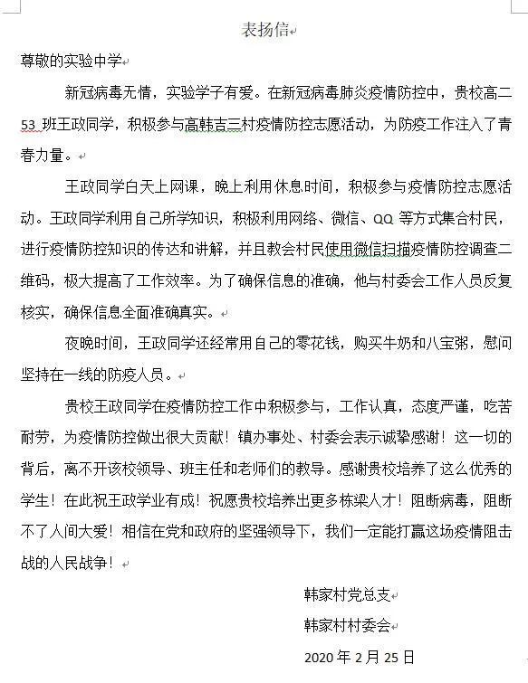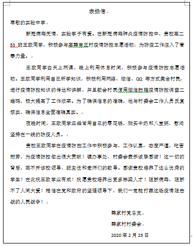 近日,学校收到一封来自疫情防控基层一线的表扬信,表扬我校高二53班王政同学在疫情防控期间,积极参加基层疫情防疫工作所做的贡献。