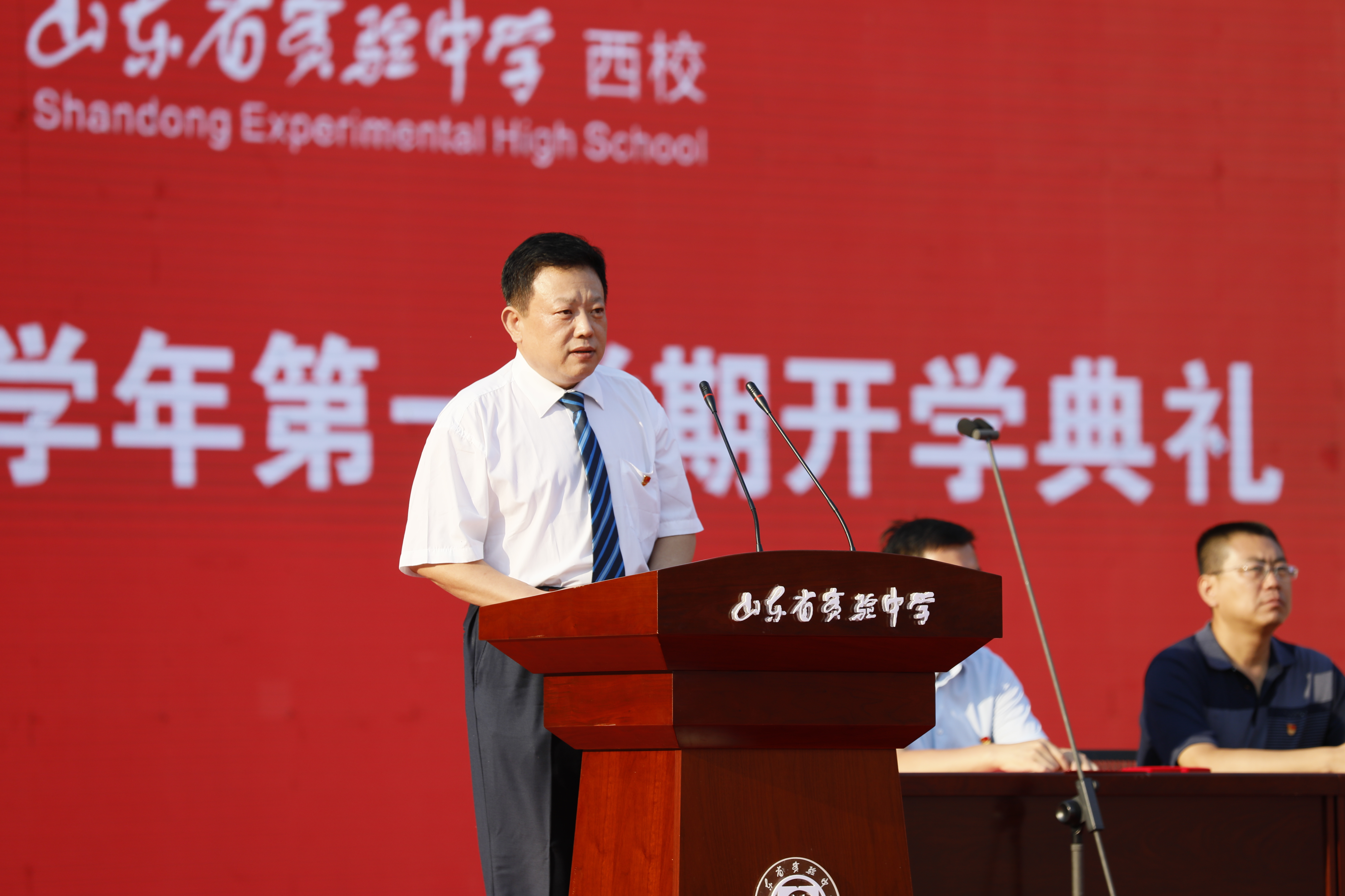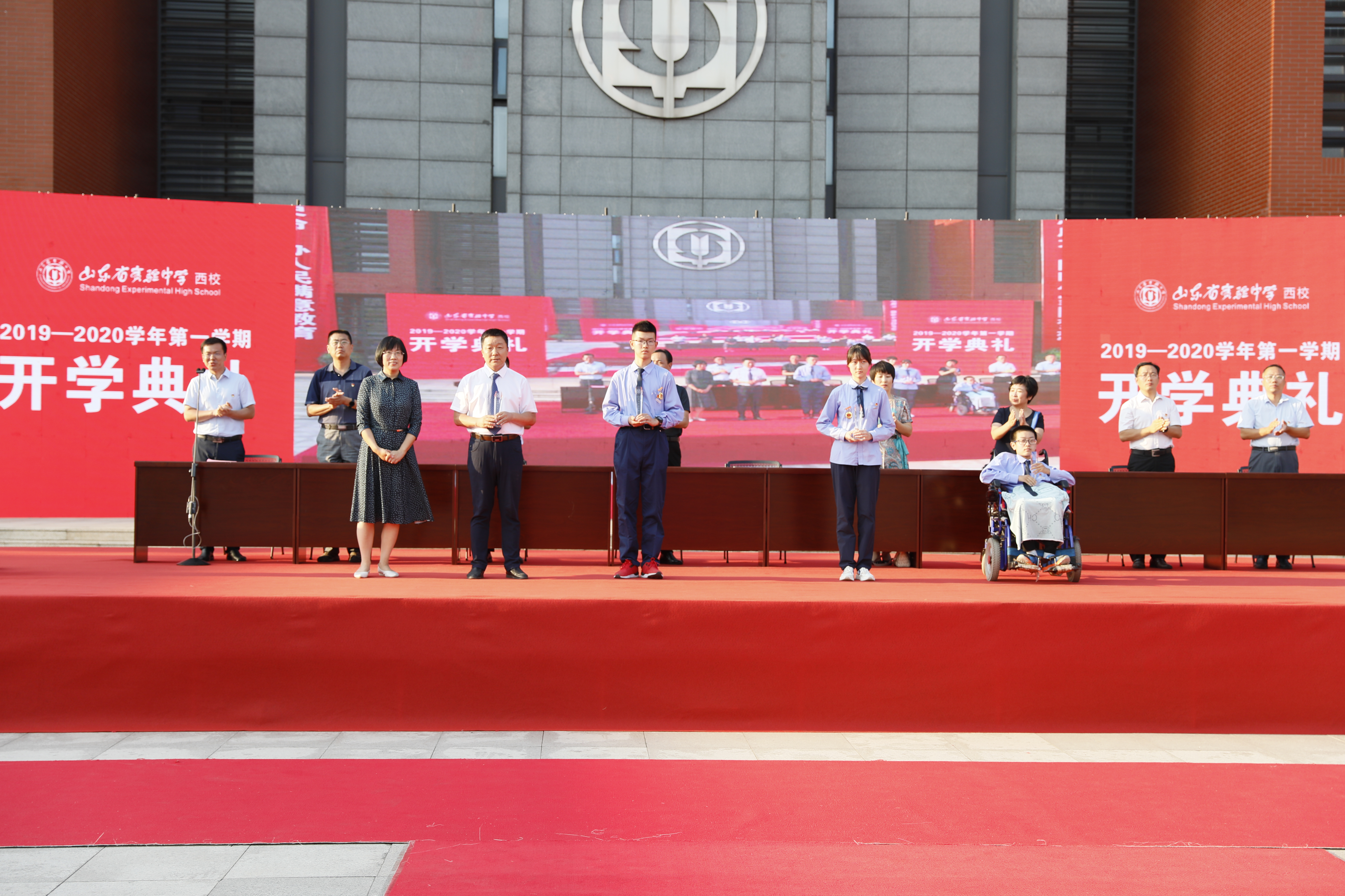 此次开学典礼,是学校认真贯彻落实中共中央和国务院庆祝中华人民共和国成立70周年群众性主题宣传教育活动作出的安排部署,济南市教育局“关于在全市中小学组织开展‘升国旗、唱国歌、百万学子向祖国宣誓’活动的通知”体现,是创造进行校本化“开学第一课”的宝贵尝试。山东省实验中学西校区陆彩霞校长、西校党委副书记、副校长张忠军、副校长钟红军、张宏刚、西校区家委会主任孙智萍参加了典礼,典礼由办公室主任王怀方主持。