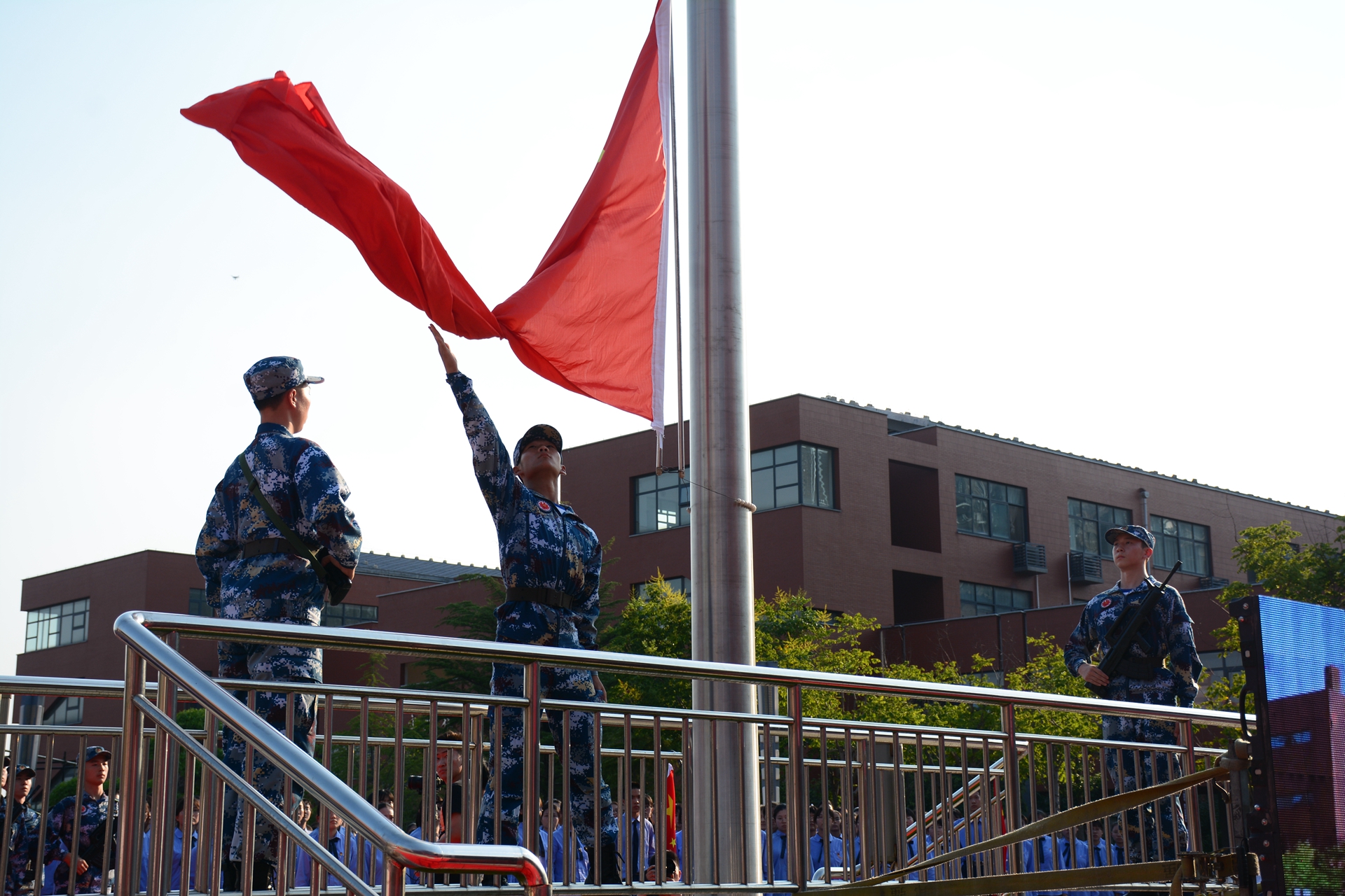 3000余名实验西校学子伴随着昂扬的口号和校歌《芳园何青青》奋进的旋律跑步进入空间广场。由航空实验班组成的国旗护卫队雄姿英发,昂首阔步,走向万众瞩目的升旗区域,全体师生深情凝视五星红旗,高唱《义勇军进行曲》。