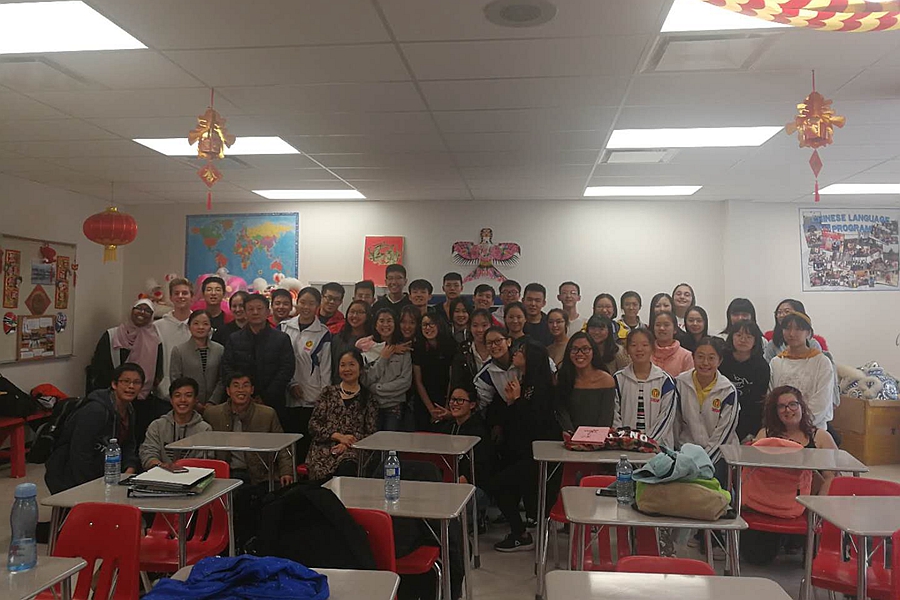 Group photo of all the teachers and students in the Chinese classroom of Rose High School