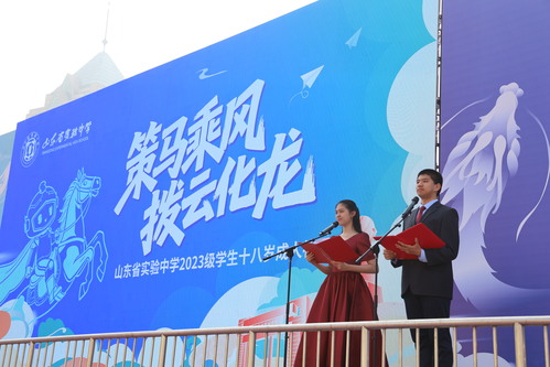3月20日,山东省实验中学举行“策马乘风,拨云化龙”2023级学生成人礼,引导学生树立正确的世界观、人生观和价值观。