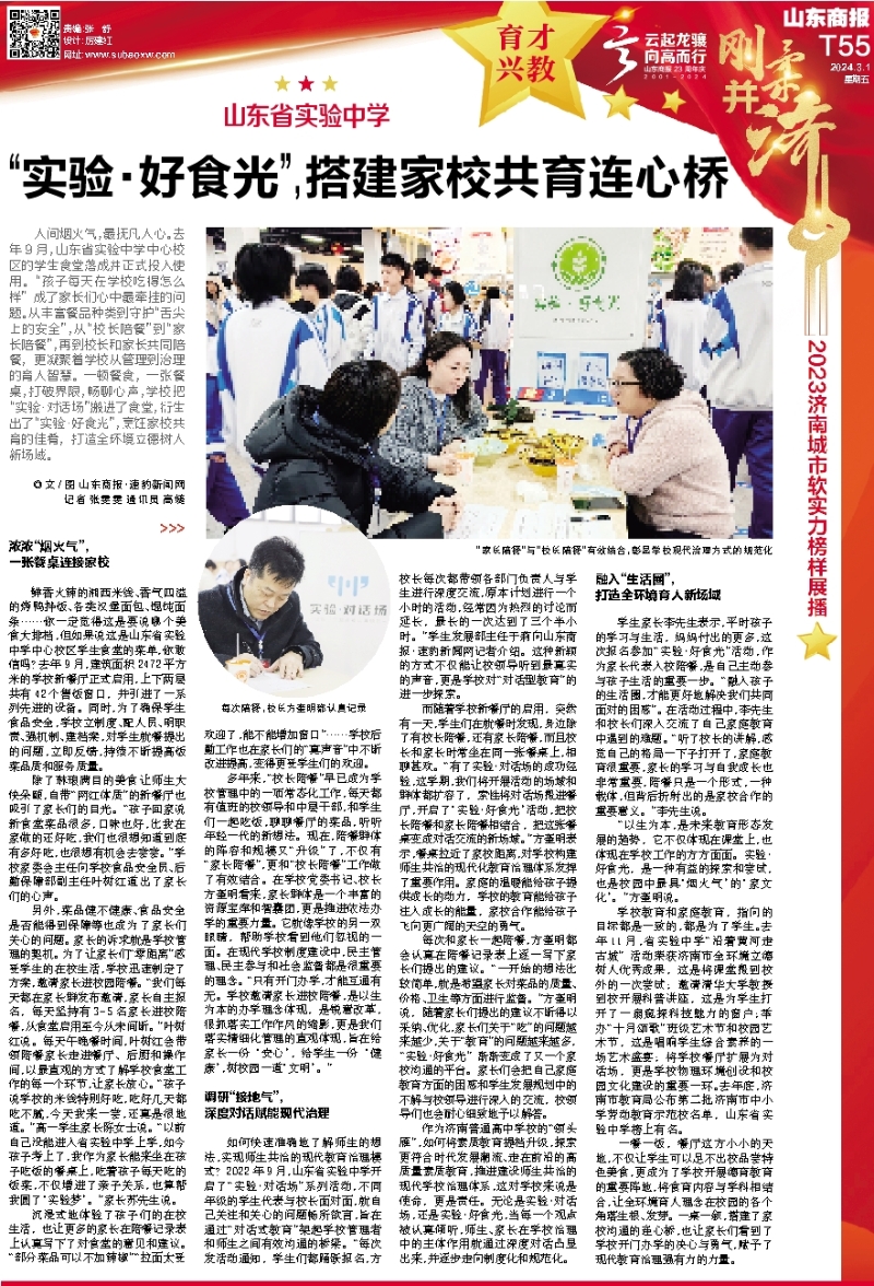人间烟火气,最抚凡人心。去年9月,山东省实验中学中心校区的学生食堂落成并正式投入使用。“孩子每天在学校吃得怎么样”成了家长们心中最牵挂的问题。从丰富餐品种类到守护“舌尖上的安全”,从“校长陪餐”到“家长陪餐”,再到校长和家长共同陪餐,更凝聚着学校从管理到治理的育人智慧。一顿餐食,一张餐桌,打破界限,畅聊心声,学校把“实验·对话场”搬进了食堂,衍生出了“实验·好食光”,烹饪家校共育的佳肴,打造全环境立德树人新场域。